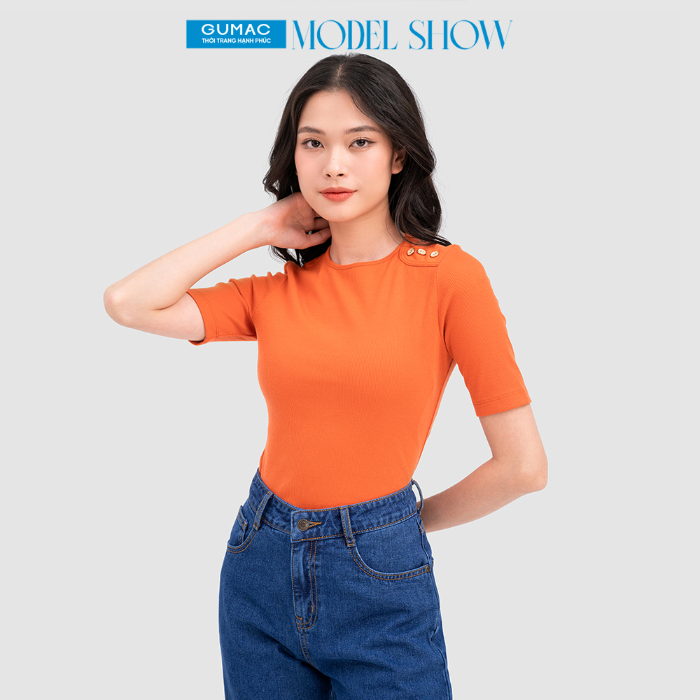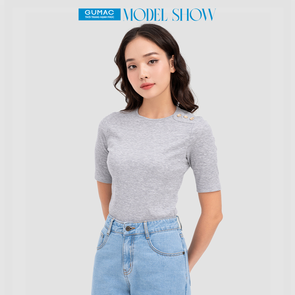 Áo thun kiểu ngắn tay. Một bên vai may nẹp đính 3 nút trang trí.