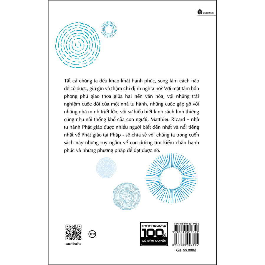 Với một tâm hồn phong phú bởi hai nền văn hóa,với những cuộc gặp gỡ với những nhà minh triết lớn, với sự hiểu biết kinh sách linh thiêng cũng như nỗi thống khổ của con người, Mathieu Ricard – nhà tu hành Phật giáo được nhiều người biết đến nhất và nổi tiếng nhất về đạo Phật tại Pháp – chia sẻ với chúng ta trong cuốn sách này những suy ngẫm say mê về con đường tìm kiếm chân hạnh phúc và những phương pháp để đạt được nó.