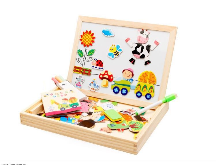 Sản phẩm được trang bị 36 hình dán, một hộp phấn và một cây bút máy, có thể viết và vẽ tương ứng trên bảng đen trắng từ tính hai mặt được trang bị trong đồ chơi. Bản thân hộp gỗ là một hộp đựng đồ, thiết kế tinh tế cho phép bảng đen trắng dễ dàng lật lên và cố định trên hộp ở một góc nhất định. Đồ chơi cho phép trẻ nhận biết hình dạng và màu sắc, trau dồi khả năng tư duy không gian của trẻ, rèn luyện trí tưởng tượng của trẻ và phát huy hết khả năng sáng tạo của trẻ. Bố mẹ có thể giúp hoặc chơi cùng bố mẹ để nâng cao tình cảm giữa bố mẹ và con cái bộ xếp hình từ tính được cấu tạo từ miếng dán + bảng gỗ + vật liệu từ tính, không rửa lại bằng nước.