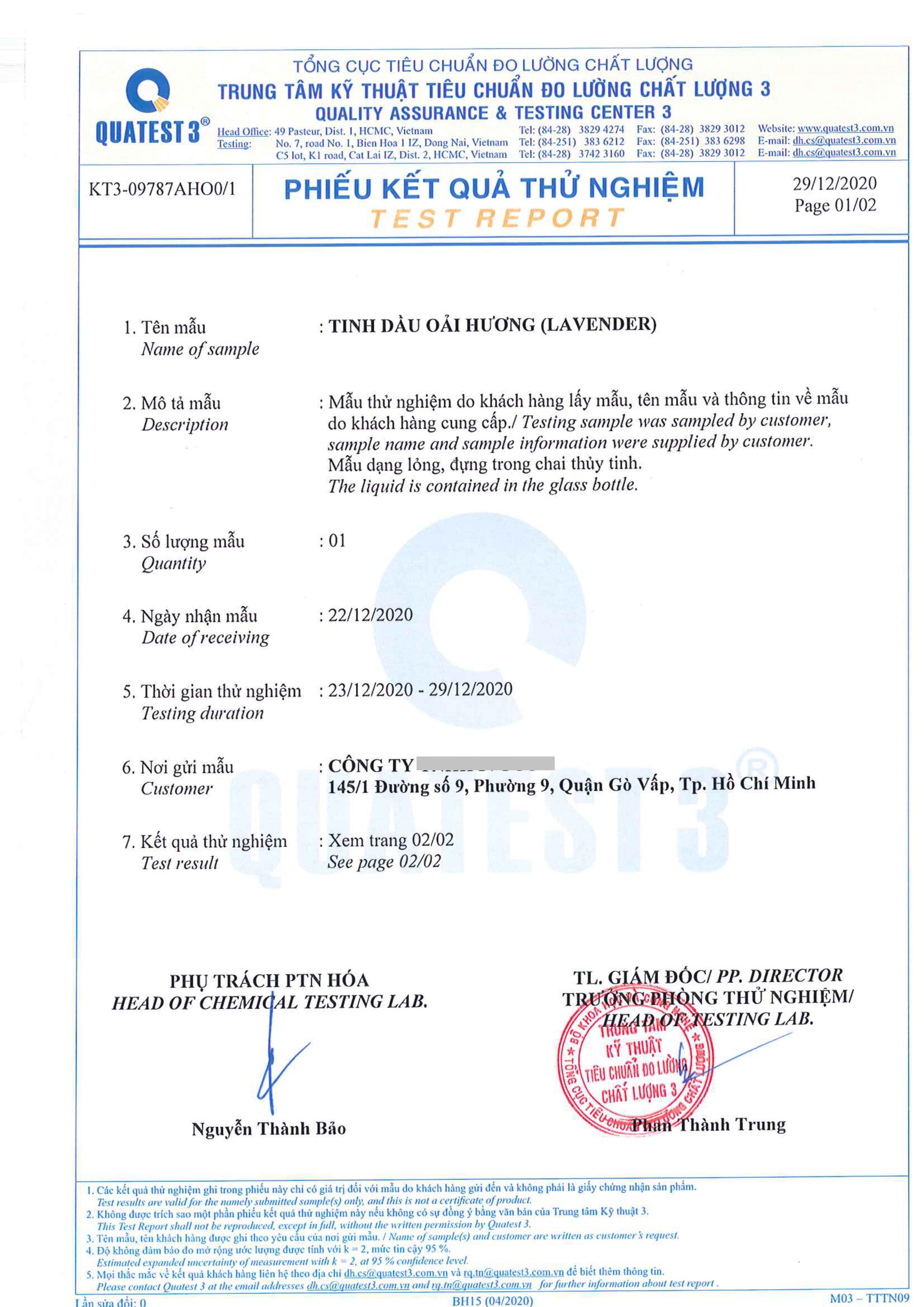 Các sản phẩm tinh dầu của chúng tôi đều được tiến hành lấy mẫu và kiểm nghiệm tại Trung tâm kỹ thuật tiêu chuẩn đo lường chất lượng 3 (QUATEST 3)/ Tổng cục tiêu chuẩn đo lường chất lượng để đảm bảo chất lượng sản phẩm đúng tiêu chuẩn và tốt nhất cho khách hàng.