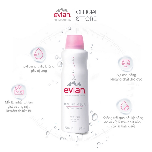 • Xịt khoáng cấp ẩm và làm dịu da evian Brumisateur chứa nguồn nước khoáng bắt nguồn từ nước mưa và tuyết tan lắng đọng tại lưu vực hàng ngàn năm tuổi trung tâm dãy Alps, được bao quanh bởi nhiều núi và sông băng.