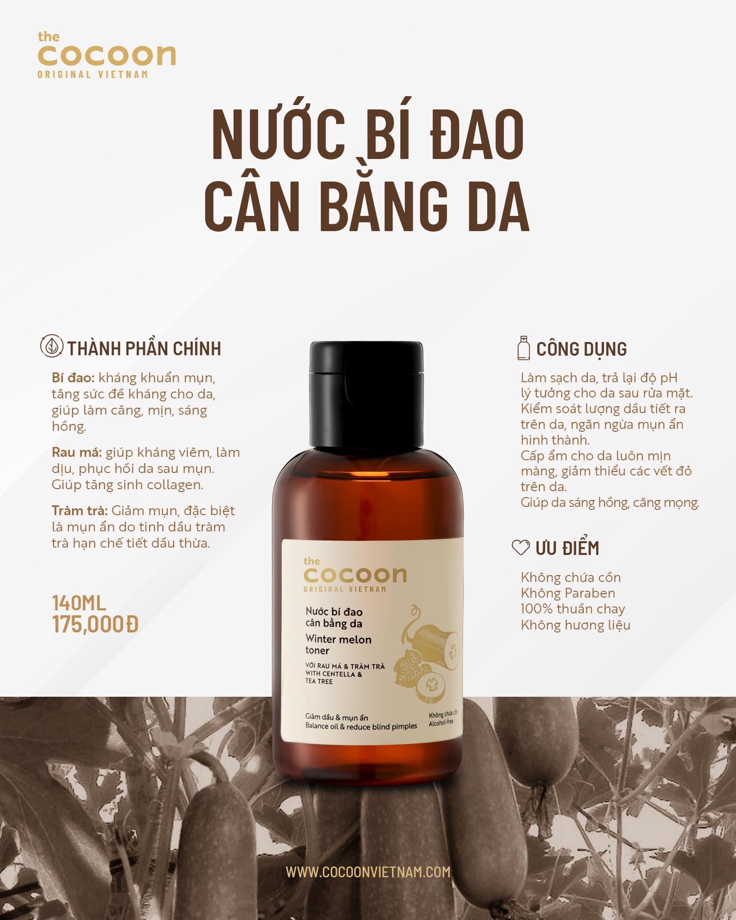 - Nước cân bằng da Cocoon chứa các thành phần tự nhiên như bí đao, rau má và tràm trà.