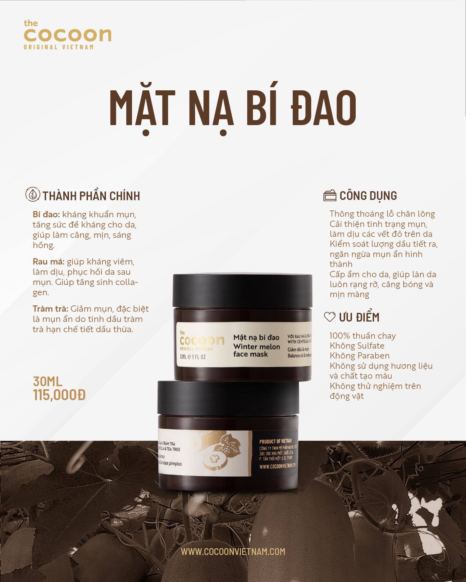 - Mặt nạ bí đao là “người em” thứ 4 trong bộ sản phẩm dưỡng da từ Bí Đao của Cocoon. Sản phẩm có thành phần chủ đạo là bí đao, bổ sung thêm rau má và tinh dầu tràm trà.