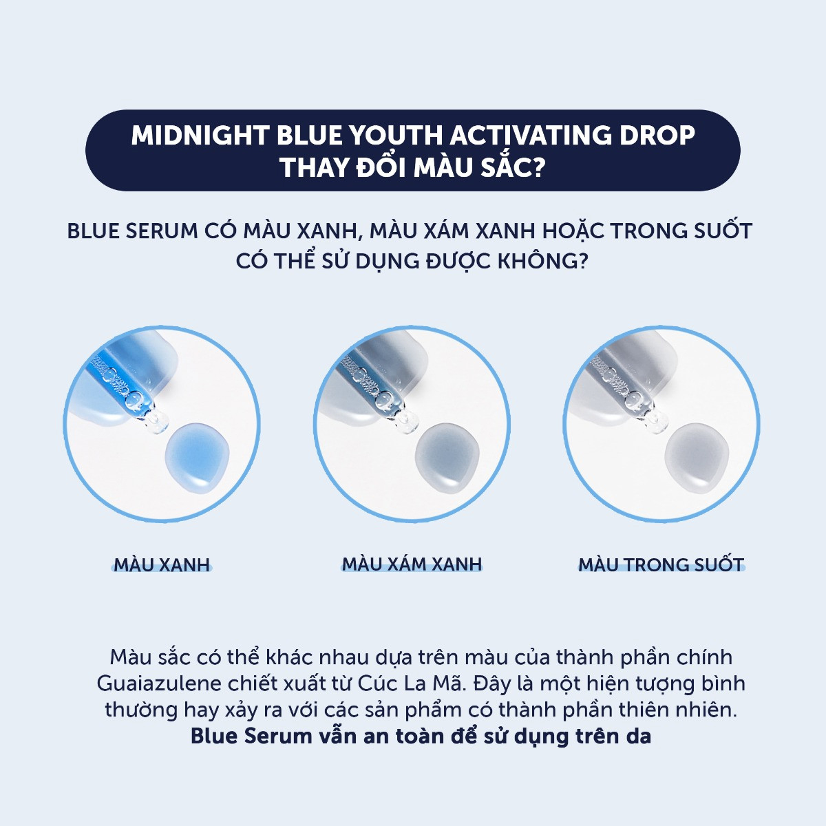 – Klairs Midnight Blue Youth Activating Drop dạng serum lỏng, nhẹ như nước, thấm rất nhanh khi sử dụng. Mỗi lần apply chỉ cần 3-4 giọt cho toàn gương mặt là đủ lượng dùng. Serum được bảo quản trong lọ thủy tinh tối màu nhắm tránh oxy hóa. Thiết kế nhỏ gọn, rất tiện để mang đi. Serum hầu như không có mùi cho nên sẽ là điểm cộng rất lớn với những bạn không thích mùi mỹ phẩm.