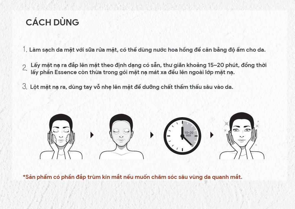 *Sản phẩm có phần đắp trùm kín mắt nếu muốn chăm sóc sâu vùng da quanh mắt.