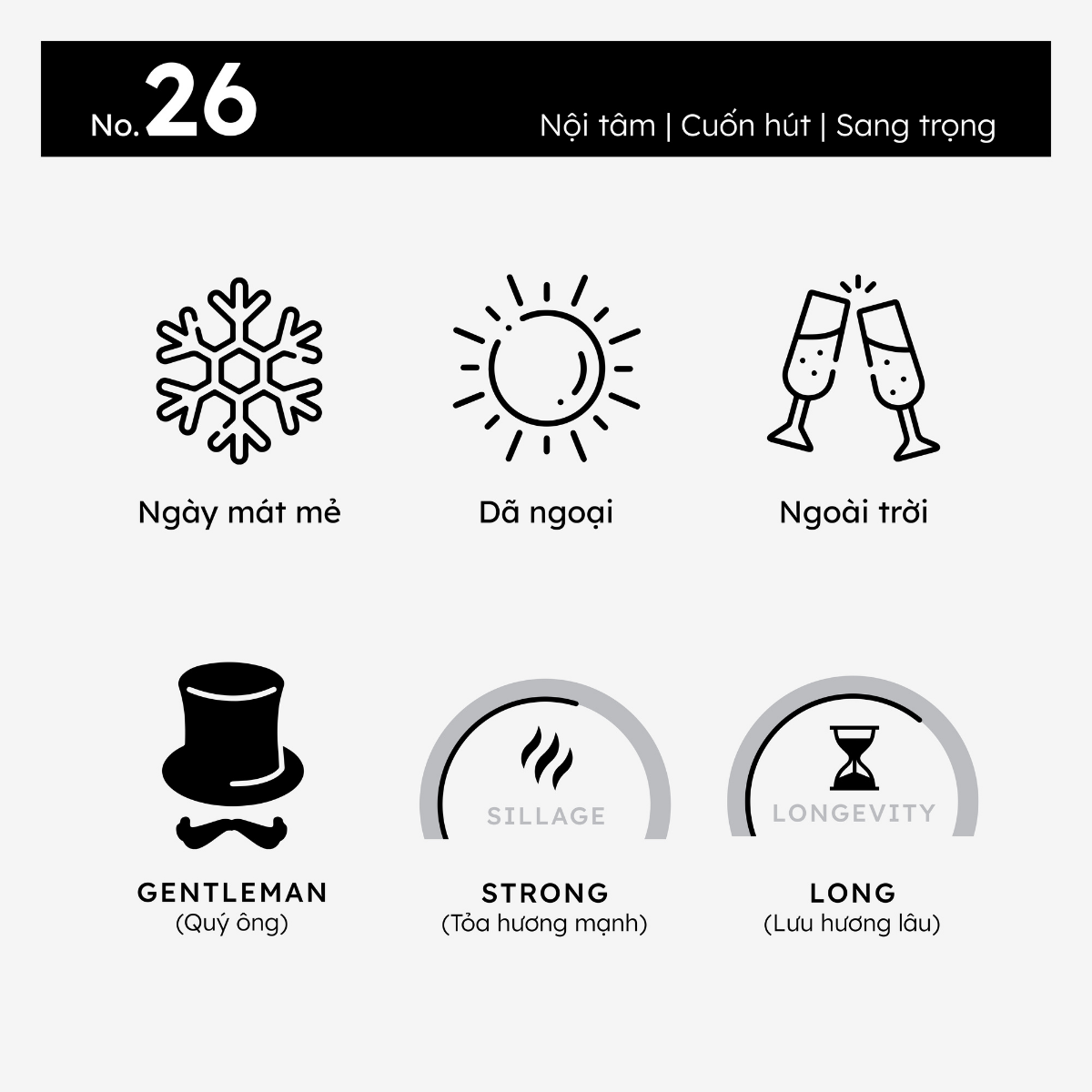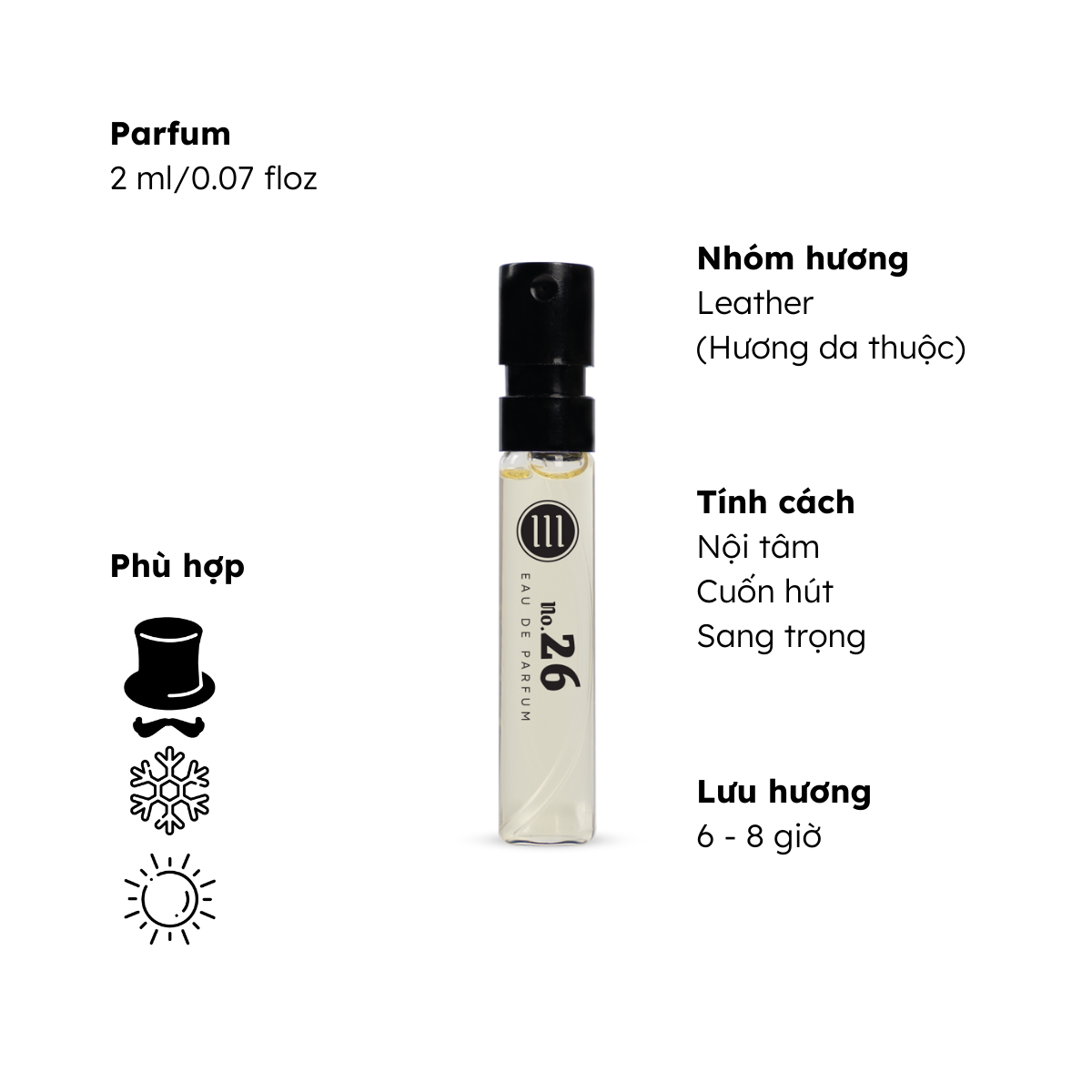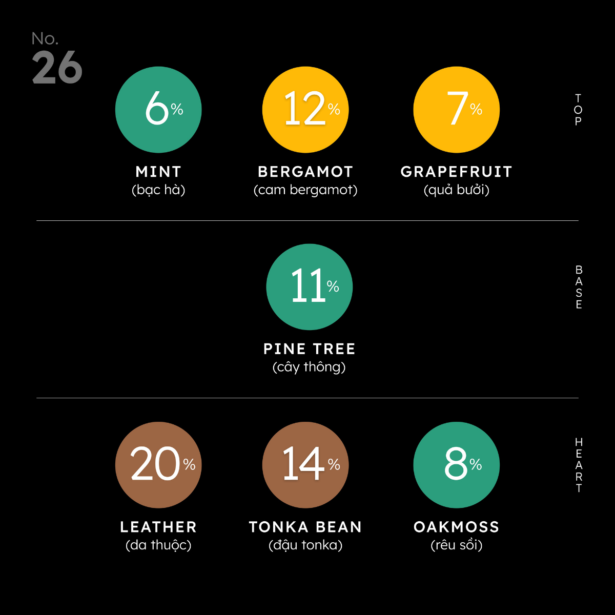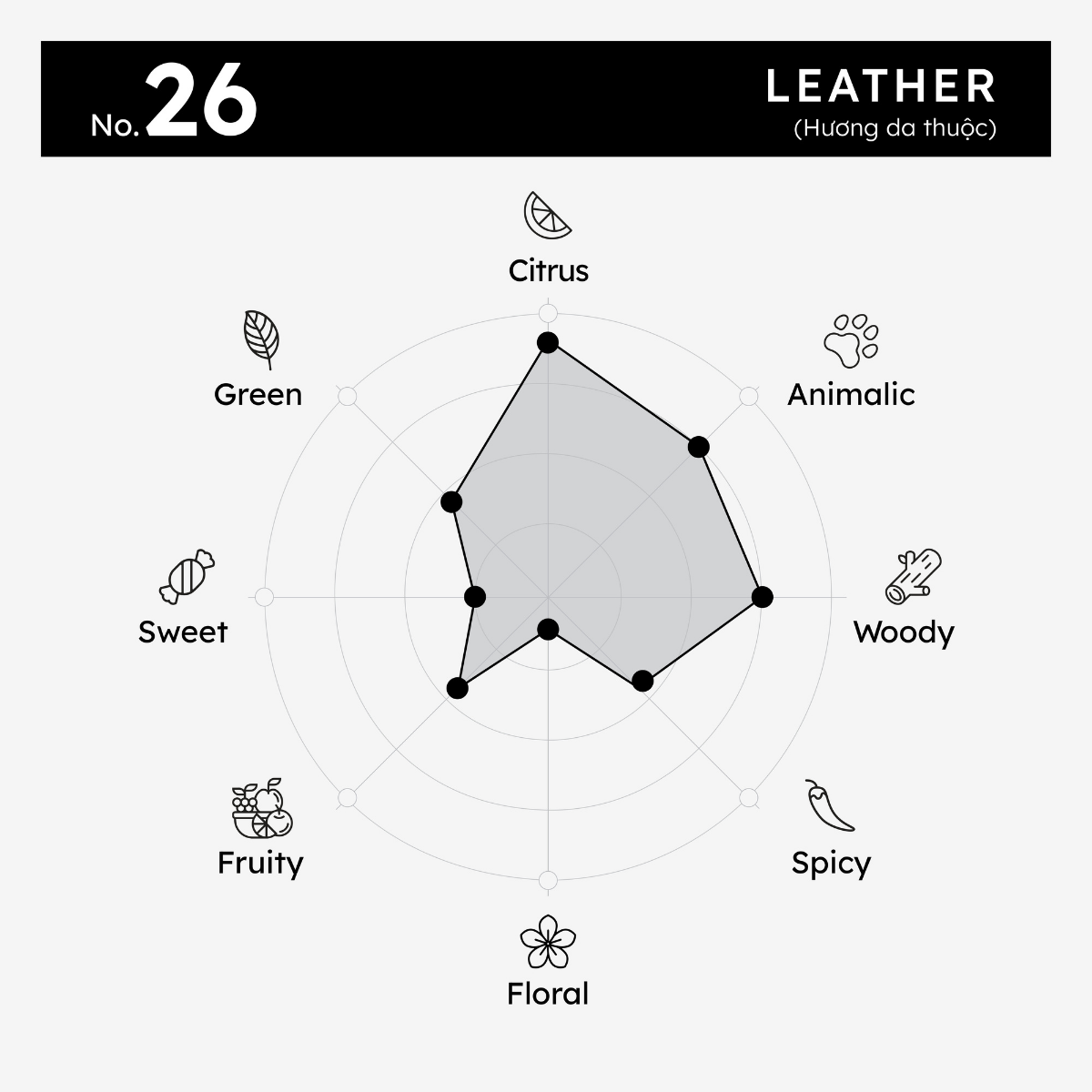 Từ thế kỷ XII, những tấm da thuộc sau khi xử lý sẽ được thêm vào một số mùi hương quý giá như hoa hồng, hổ phách hoặc xạ hương. Lấy cảm hứng từ những sản phẩm làm bằng da được ướp hương của giới quý tộc thời kỳ Phục hưng, nốt hương da thuộc (leather) đã ra đời như một trong những sáng tạo tuyệt vời nhất của ngành chế tác. Trong No.26 (Private Drug), da thuộc mang nhiều khía cạnh hương thơm khác nhau, từ gỗ ám khói đến nhựa hăng cay và sau cùng là một chút hương hoa dịu ngọt. Khi thêm nốt hương da thuộc vào tầng hương của rêu sồi (oakmoss) và đậu tonka (tonka bean) nồng nàn, sự kết hợp này ngay lập tức khiến No.26 trở nên bí ẩn và cuốn hút không ngờ.