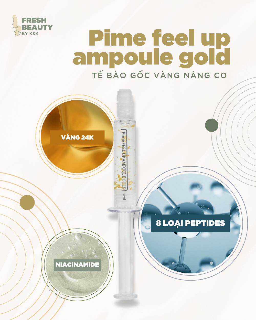Tế bào gốc vàng nâng cơ Pime chứa các thành phần như vàng 24k, 8 loại peptides, tế bào gốc, niacinamide cải thiện hiệu quả da lão hóa, giúp bù đắp và kích thích da tự sản sinh collagen, tăng độ đàn hồi da, làm mờ nếp nhăn hiệu quả, cấp ẩm, kiềm dầu, se khít lỗ chân lông, giúp da trắng hồng căng bóng tự nhiên, phục hồi làn da sau lăn kim, laser
