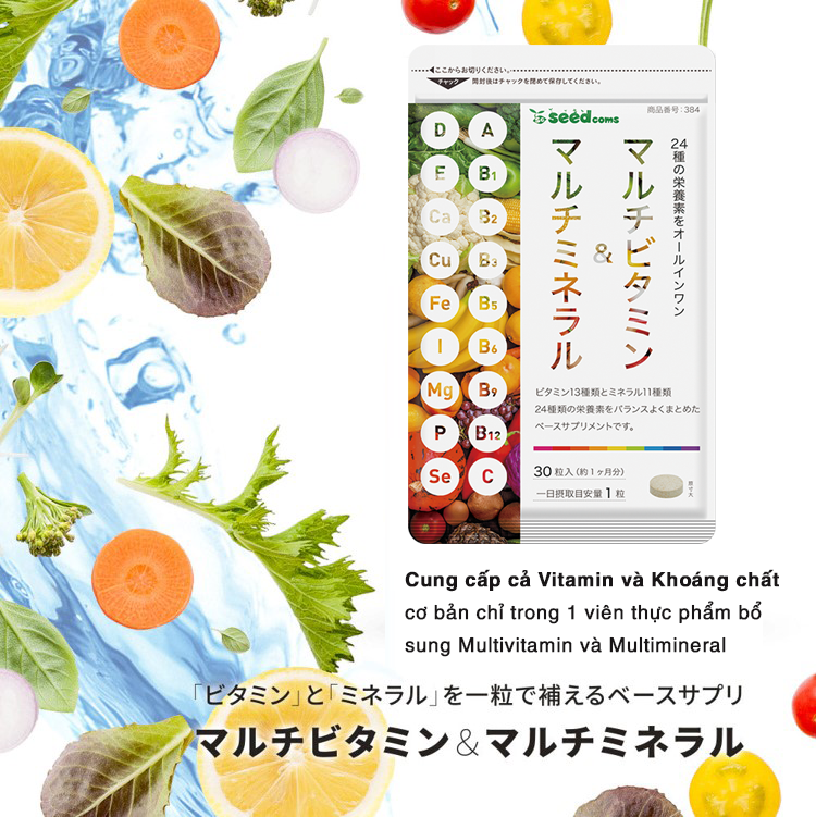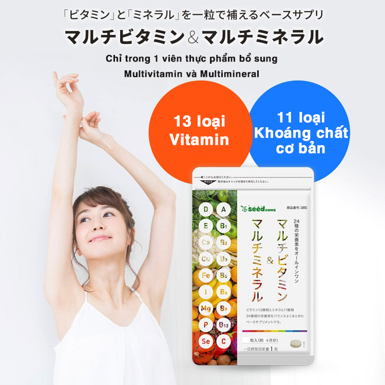 Viên uống vitamin tổng hợp và khoáng chất Seedcoms Nhật Bản với thành phần từ những nhóm vitamin thiết yếu như: vitamin E, gelatin, vitamin C, vitamin B6, vitamin B1 giúp bạn bổ sung đầy đủ các loại vitamin cần thiết cho cơ thể mỗi ngày.