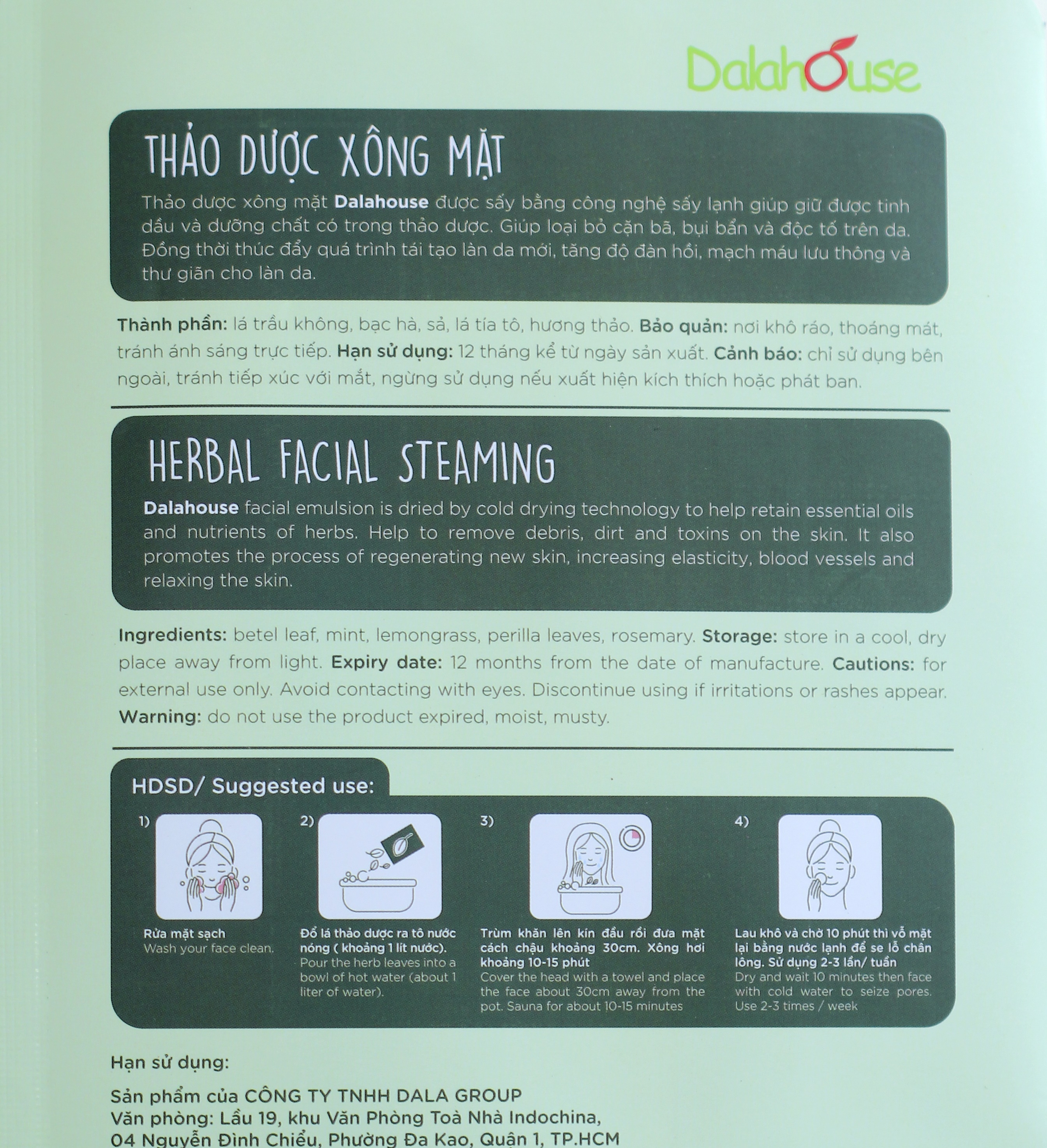 Thảo mộc xông mặt Dalahouse được sấy bằng công nghệ sấy lạnh, giúp giữ được tinh dầu và dưỡng chất có trong thảo dược. Giúp loại bỏ cặn bã, bụi bẩn và độc tố trên da. Đồng thời thúc đầy quá trình tái tạo làn da mới, tăng độ đàn hồi, mạch máu lưu thông và thư giản cho làn da.